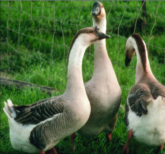 African geese are beautiful birds that are excellent foragers and good layers with above average fertility. They are typically noisier than other goose breeds. In cooler climates, watch their knob for orange spots in the winter. This is sign of frostbite. The tissue will usually heal and return to its normal black coloring the following year. This breed originated from the wild Asian Swan Goose of China. It was introduced into Europe in the late 1700s and into the United States in the mid 1800s. How these geese from China got the name African has always been puzzling. Apparently, it was usual to apply the term “Guinea” to anything foreign and of uncertain origin. As Guinea is off the coast of Africa, it appears the African goose got its name in a similar way. Of the geese we offer African are the second meanest. All our geese make excellent “watch dogs” as they are keen at alerting you to predators as well as people. They are also all good at weeding and domestic meaning they cannot fly.